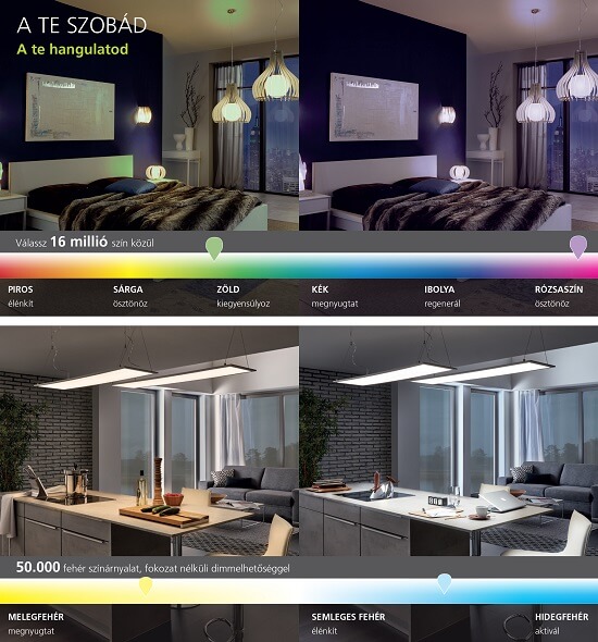 Az EGLO connect ezeknél több: egyszerre van benne a fényerő változtatásának, a színnek, és a színhőmérséklet változtatásának lehetősége, miközben nemcsak 16 szín és 3 színhőmérséklet közül választhatunk, hanem a világon előforduló bármely színt (16 millió!) és színhőmérsékletet beállíthatjuk. Emellett programozható, vagy ha nem akarunk „bajlódni” a beállításokkal, akkor használhatjuk a gyárilag beállított effektusokat, mint pl. naplemente.