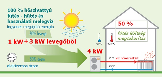 A levegős hőszivattyúk olyan készülékek, amelyek kiegészítő fűtés nélkül kifűtik otthonunkat, kimagaslóan energiatakarékos módon, továbbá a nyári kánikulában képesek a szükséges hűtésigényt dinamikusan és zavartalan módon biztosítani. A rendszer a levegő hőenergiáját felhasználva képes 1kWh villamos energiából, 4kWh fűtési energiát biztosítani.